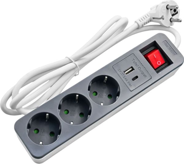 LAMTECH 3WAY SURGE PROTECTOR WITH 1XTYPE-C 1XUSB 3XSCHUKO BLACK