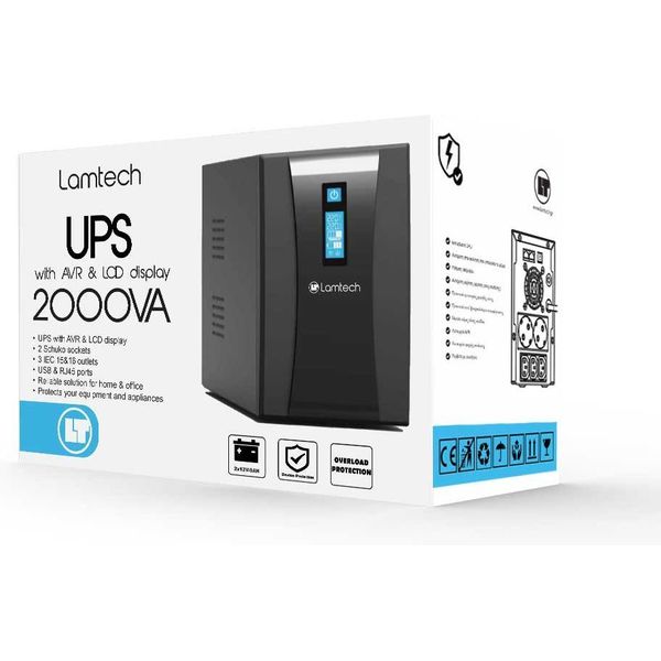 LAMTECH UPS WITH AVR AND LCD DISPLAY 2000VA, 2X12V/9AH, 2XSCHUKO, 3XIEC, USB & RJ45 PORT LAM113539
