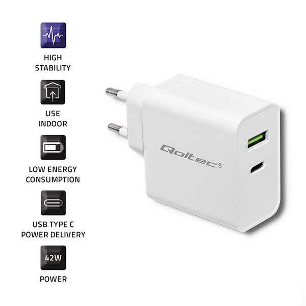 QOLTEC CHARGER 42W 5-20V 2.4-3A USB TYPE C PD USB WHITE