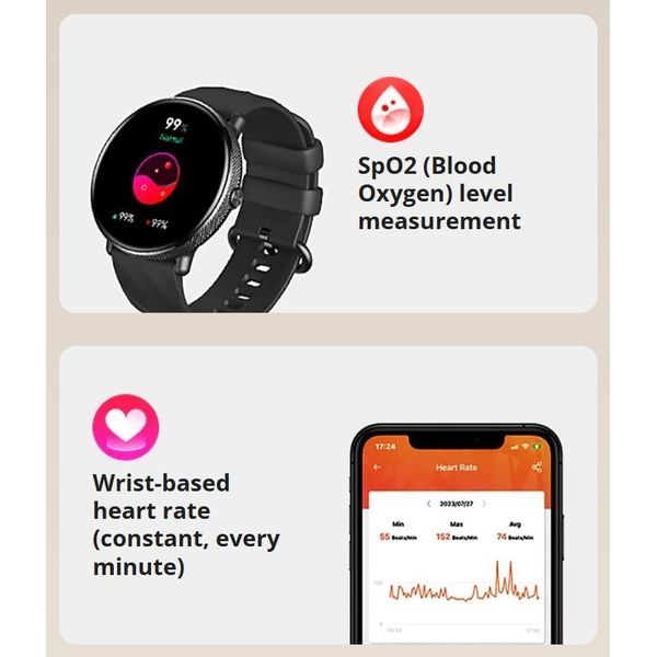 Wrist heart rate monitor, Pulse Ox blood oxygen saturation monitor, 3-Axis accelerometer and 3-Axis gyroscope sensor