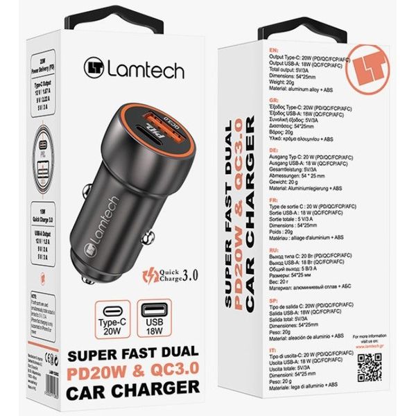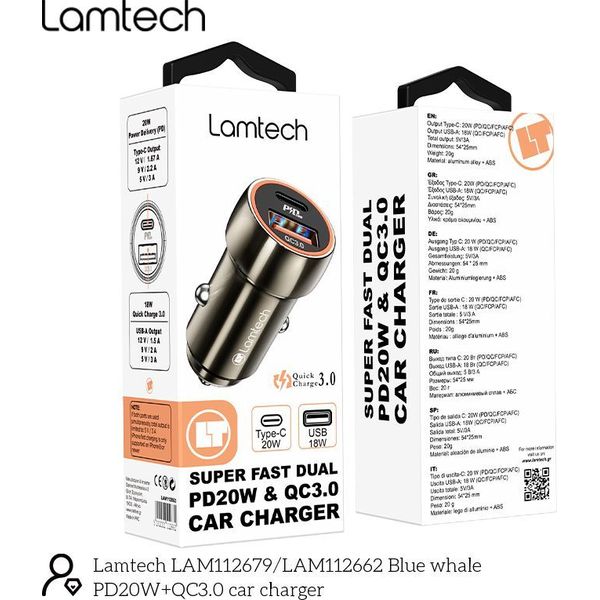 LAMTECH METAL CAR CHARGER QC3.0 & PD20W METAL GRAY LAM112662