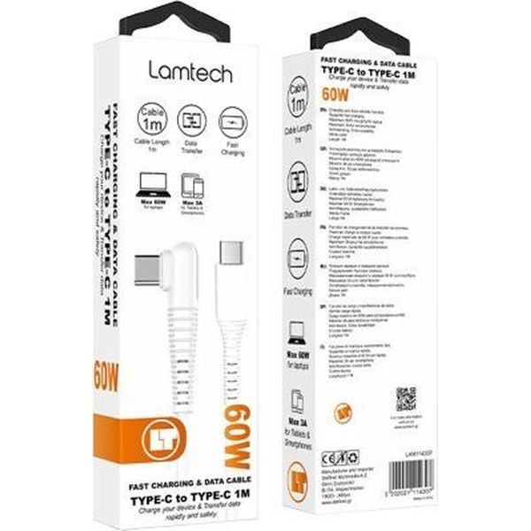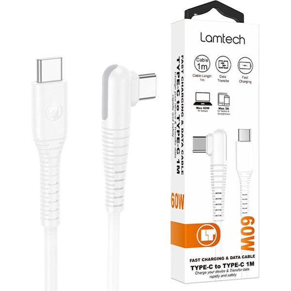 LAMTECH TYPE-C TO TYPE-C 60W ANGLED DATA & CHARGE CABLE 1M WHITE LAM114307