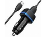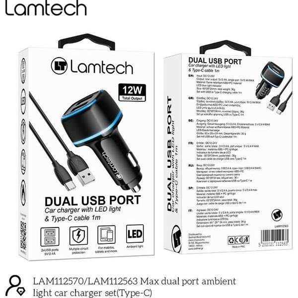 LAMTECH 2XUSB 2,4A CAR CHARGER WITH TYPE-C CABLE 1M BLACK LAM112563