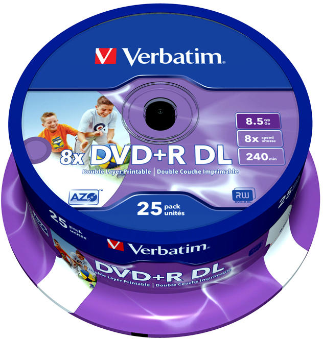 VERBATIM DVD+R DUAL LAYER 8X 8.5GB PRINTABLE CAKEBOX 25