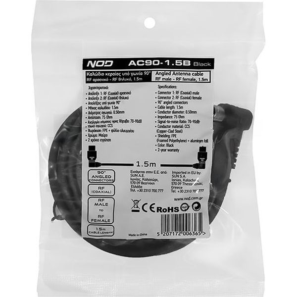 ΚΑΛΩΔΙΟ ΚΕΡΑΙΑΣ ΥΠΟ ΓΩΝΙΑ 90° RF ΑΡΣΕΝΙΚΟ - RF ΘΗΛΥΚΟ 1.5M NOD AC90-1.5B BLACK