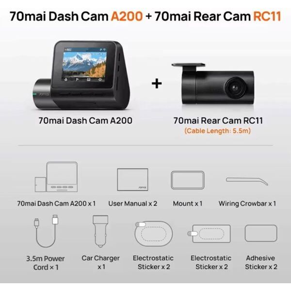70MAI A200-1 FRONT & REAR DASH CAM W. SCREEN, SET WITH RC11 REARVIEW CAMERA, 1080P 60FPS 130FOV 500