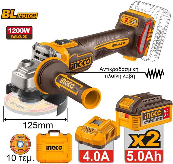 ΓΩΝΙΑΚΟΣ ΤΡΟΧΟΣ ΜΠΑΤΑΡΙΑΣ 125MM 20V LI-ION ΜΕ ΑΝΤΙΚΡΑΔΑΣΜΙΚΗ ΠΛΑΪΝΗ ΛΑΒΗ INGCO CAGLI2120272E